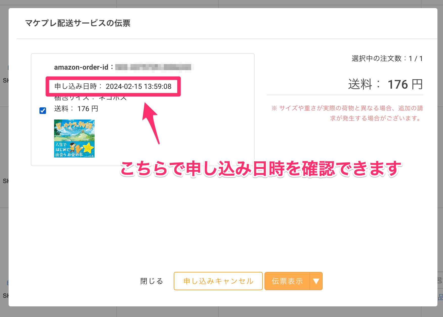 Q10.申込日時の確認はできますか? A10.「マケプレ配送を確認」ボタンより申し込み日時を確認することができます。