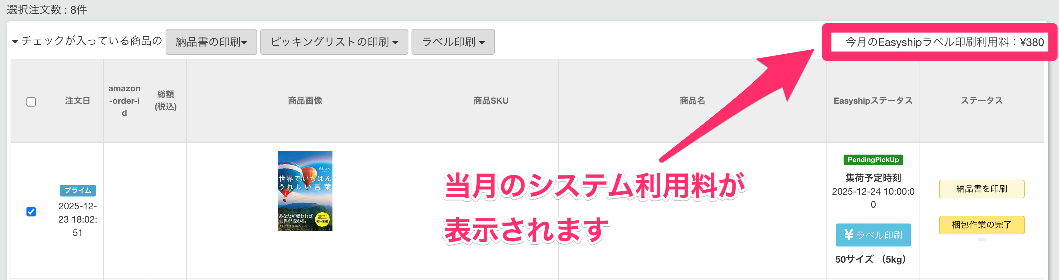 Q10. システム利用料はどうやって確認できるの? A10. 当月のシステム利用料は未発送の注文(Easyship)画面の注文一覧の右上の「今月のEasyshipラベル印刷利用料:」の部分でご確認いただけます。